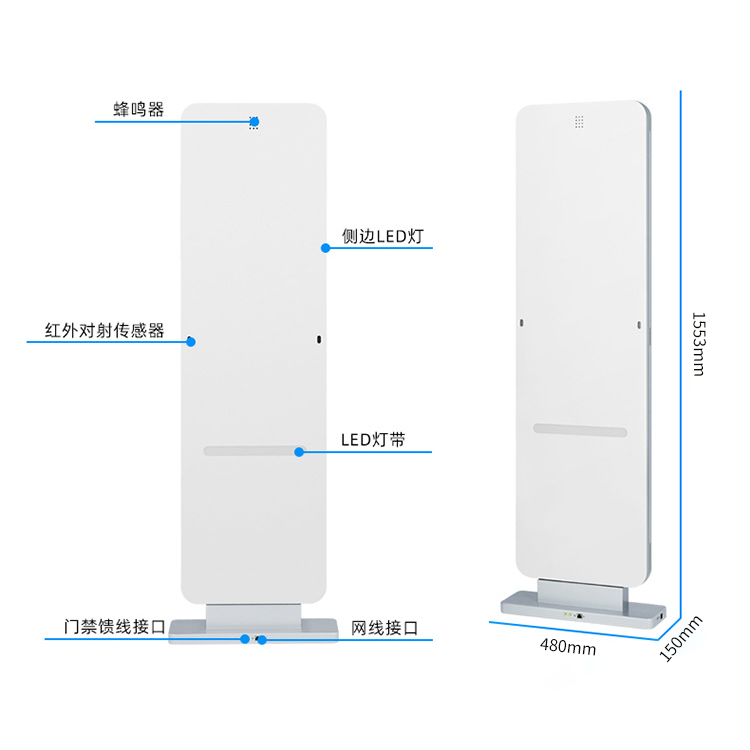 超高频门禁防盗安全门通道的读取能力极强,可读取多标签,极低漏读率和误读率。天线特别设计,实现水平面窄波束设计,门禁覆盖区域准确,无盲点。内置报警灯和蜂鸣器,报警灵敏,安全可靠,支持声光一吃体报警,可单独设置报警延时时长。RFID安全门摆放距离更加宽阔,最远可达4M可调。外观时尚,面板图案内容可批量定制。安全门通道与后台系统相结合,可提供多种统计信息。还可外接LED显示器,实时显示通过图书信息及数量,并可统计进出人数。能通过红外触发读取,可大大延长设备使用寿命。EAS防盗位,支持可按标签需要任意设置一位防盗位。